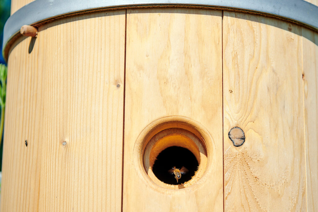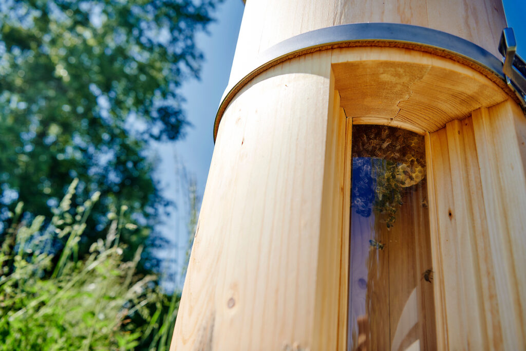 Da ich erst im April mit der Bienenhaltung angefangen habe, sind meine Erfahrungen noch ganz frisch. Mein primäres Ziel ist es, Bienenvölkern einen natürlichen, wilden Lebensraum zu bieten. Dafür habe ich im Jahr 2020 zwei Bienenstock-Modelle von SwissTree als Unterschlupf installiert. Der Lebensraum Swiss Tree wurde dank der Zusammenarbeit zwischen FreeTheBees und der Firma Nova Ruder entwickelt. Swiss Tree erleichtert den Bienenvölkern eine Rückkehr in die Natur. Seine Form gleicht den natürlichen Hohlräumen in Bäumen, in denen die Insekten in der wilden Natur zuhause sind. Im Gegensatz zum traditionellen Bienenstock sind die Wände des SwissTree dicker und bieten den Bienen einen besseren Schutz vor der Hitze des Sommers und der Kälte des Winters. In einem Swiss Tree kann ein Bienenvolk mit nur drei Kilo Honig überwintern. Im traditionellen Bienenstock benötigt es zum Überleben mindestens viermal soviel.