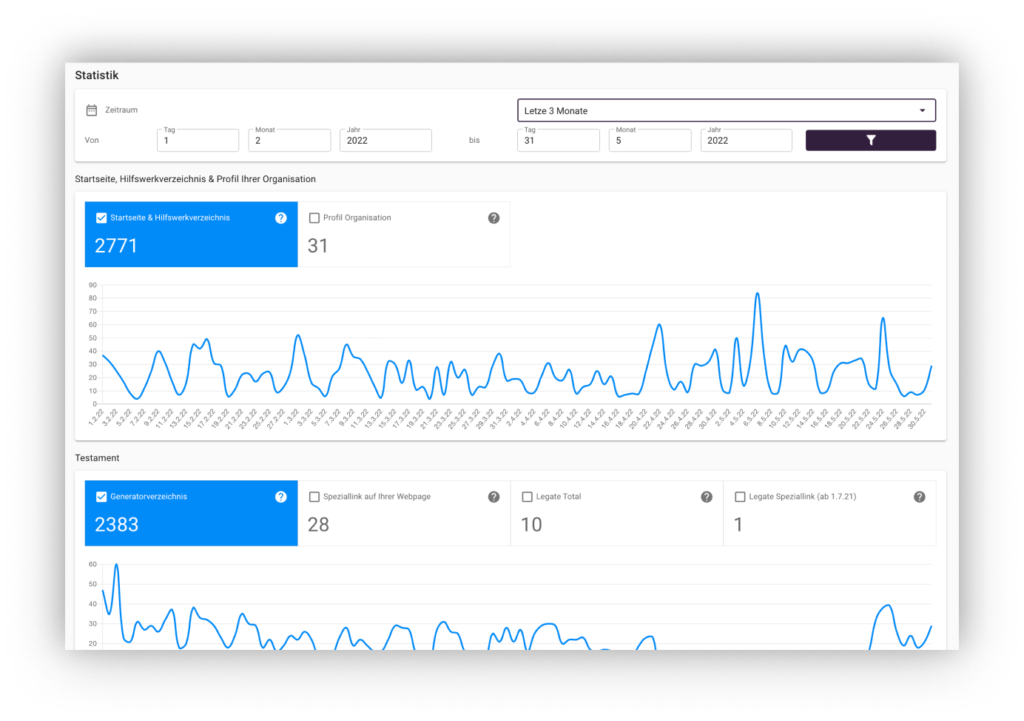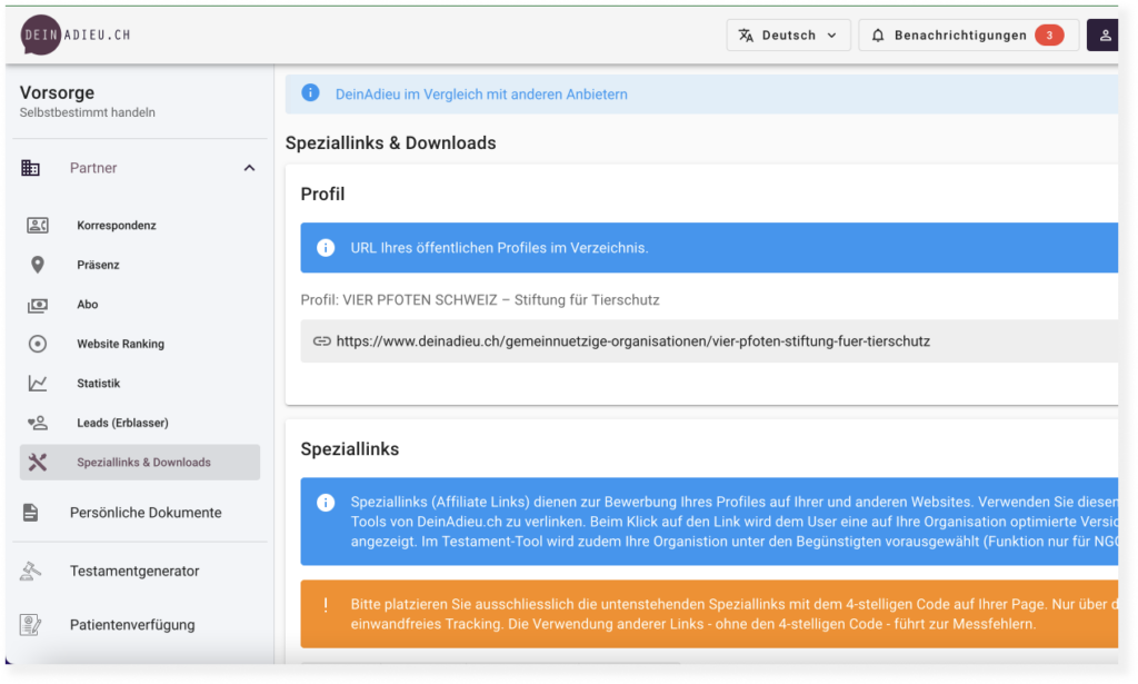 Über Ihren Partnerlogin erhalten Sie Zugang zu Echtzeit-Messdaten wie Klicks, Zugriffe, Abschlüsse sowie Leads, welche über den Online Testament-Assistent entstehen. Zudem bieten wir Ihnen eine Fülle weiterer Ressourcen für Ihre Arbeit.