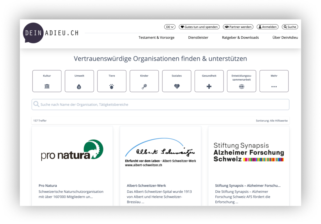 Ihre Erbschafts-Marketing-Website, auf welcher Sie auf die Unterstützungsmöglichkeiten Ihrer Organisation aufmerksam machen, muss einfach auffindbar sein. Das Thema Vermächtnis/Erbschaft muss prominent beschrieben werden und der Online Testament-Assistent einfach zugänglich sein. Hier ein Beispiel: Stiftung Denk an mich.